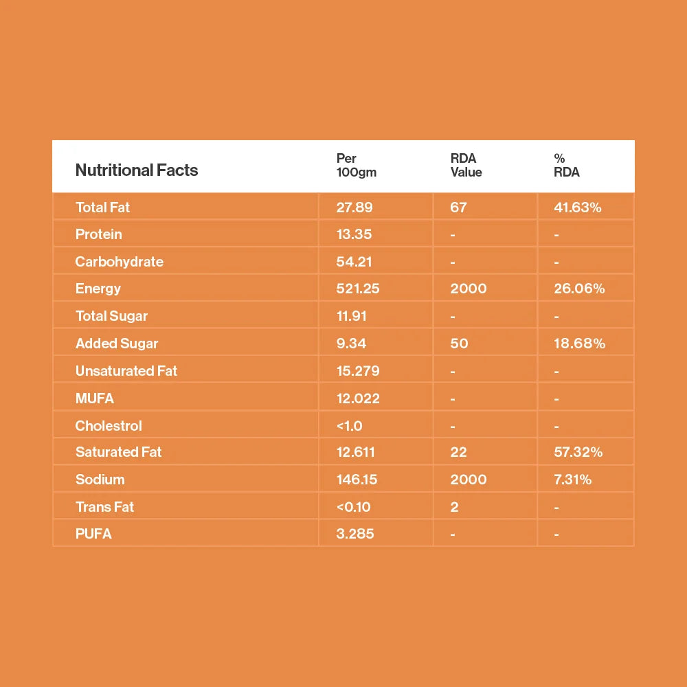 Rolled Oats, Almonds, Cinnamon, Sea Salt, Orange Zest, Vanilla Extract, Organic Honey, Extra Virgin Olive Oil, Raw Cocoa Powder, Vegan Sugar Free Dark Chocolate Chips.