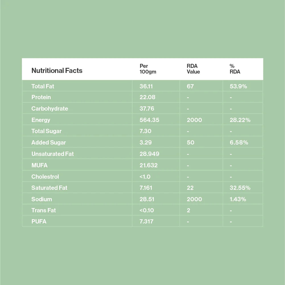 Rolled Oats, Unsweetened Peanut Butter, Almonds, Sunflower Seeds, Chia Seeds, Cinnamon, Sea Salt, Vanilla Extract, Organic Honey, Extra Virgin Olive Oil, Vegan Sugar Free Dark Chocolate chips.